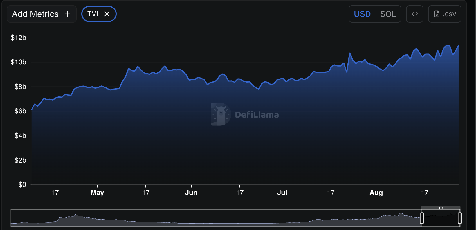 Data kunci: Total Value Locked (TVL) Solana mencapai $11,395 miliar, naik lebih dari 4% dalam sepekan. (sumber DefiLlama)