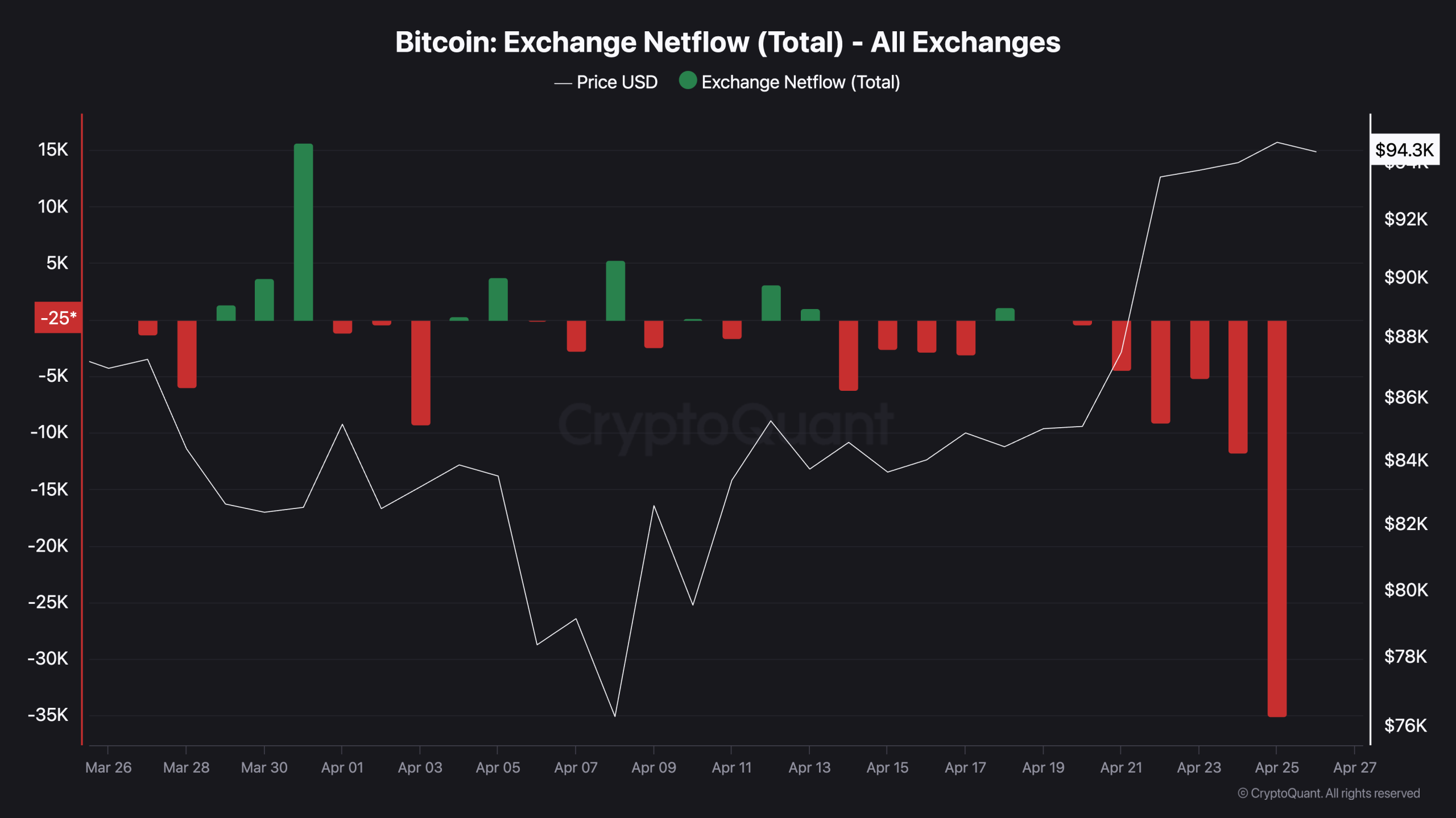 On-chain data from CryptoQuant shows that the total Bitcoin withdrawn from exchanges that day reached 35,101 BTC. Such significant outflows to reserve wallets are often associated with strong institutional activity — a factor that historically precedes periods of heightened volatility.