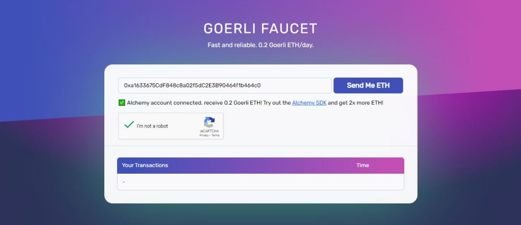 Alchemy merupakan salah satu website penyedia token Goerli faucet paling terkenal. Situs ini menyediakan 0,2 GETH gratis yang bisa ditarik setiap 24 jam sekali. Untuk bisa mendapat token Goerli di Alchemy, pengguna perlu membuat akun dan melakukan log in.