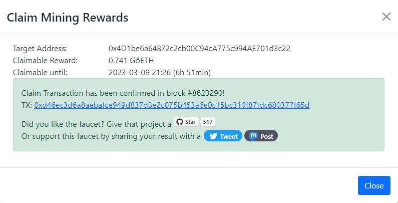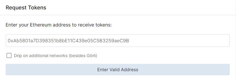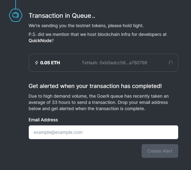 QuickNode menyediakan token testnet Goerli sebanyak 0,05 GETH untuk pengguna. QuickNode juga menyediakan opsi klaim 0,25 GETH bila menyertakan tautan cuitan request di Twitter, namun opsi ini sangat sulit dicoba.