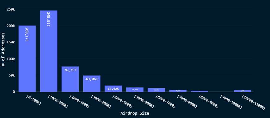 Sisanya 547.463 atau 88% telah menerima airdrop. Adapun jumlah rata-rata airdrop Arbitrum yang dibagikan mencapai 1.859 ARB per wallet. Paling banyak, sekitar 245.000 alamat wallet menerima airdrop 1.000-2.000 ARB. Terbanyak kedua, sekitar 200.000 wallet menerima 0-1.000 ARB.