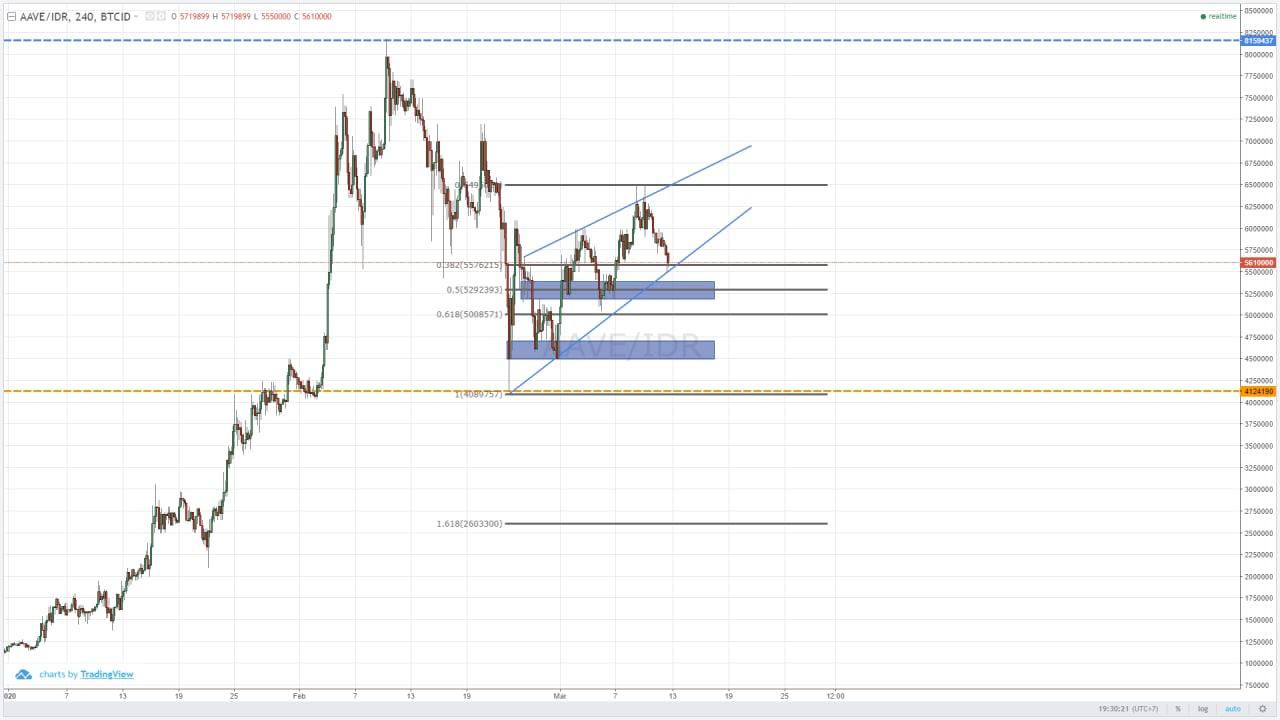 Pada saat harga menyentuh Area Koreksi 2 dan di saat yang bersamaan trend bullish masih kuat, seharusnya harga koin ini langsung mantul ke atas, nerusin trend bullish. Tapi kalau pergerakan Bitcoin tidak mendukung, dalam artian harga Bitcoin juga masih terkoreksi, kemungkinan yang bakal terjadi, AAVE turun sampai Area Koreksi 3.
