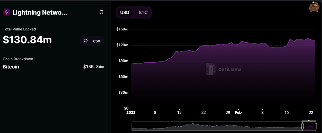 Menurut data DefiLlama, total likuiditas Lightning Network dalam kontrak DeFi mencapai $130,84, naik hingga 35% sepanjang 2023.