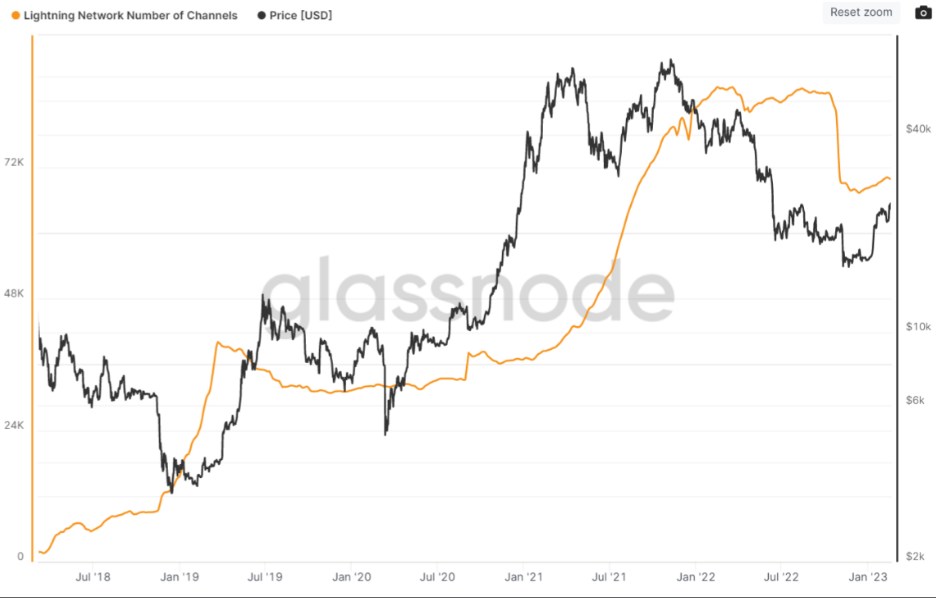 Jumlah channel di Lightning Network sempat anjlok pada November tahun lalu saat exchange FTX ambruk. Namun sejak awal 2023, tercatat sudah ada 2.000 channel yang telah ditambahkan ke dalam jaringan.