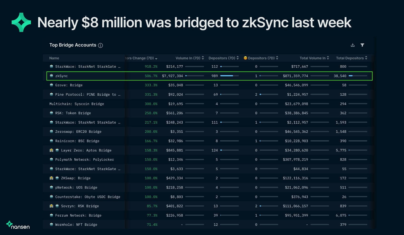 Data Nansen mengungkapkan, lebih dari 39.000 alamat wallet telah memasukkan dana hingga $871 juta ke zkSync dalam tujuh hari ini. Jumlah alamat wallet zkSync tercatat naik hingga lima kali lipat.