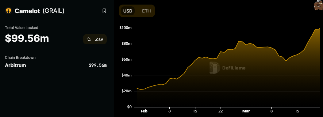 Portalkripto.com — Decentralized exchange (DEX) di jaringan Arbitrum, Camelot, mengalami kenaikan total value locked (TVL) hingga 50% dalam sepekan terakhir ini. Menurut DefiLlama, TVL Camelot pada Selasa, 21 Maret 2023, bahkan hampir mencapai $100 juta.