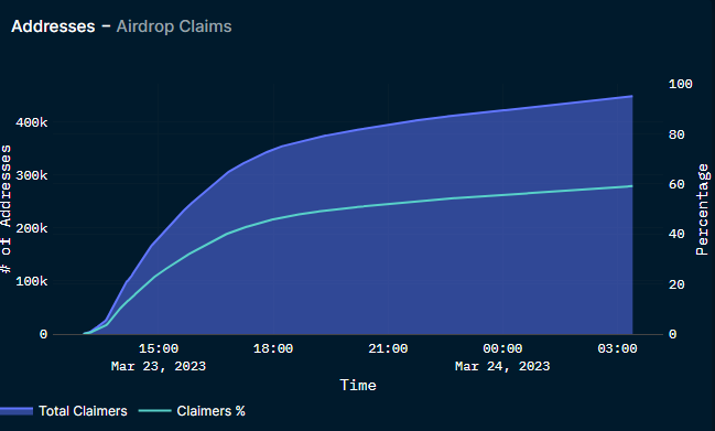 Menurut dana Nansen, pada 24 Maret 2023 siang, klaim airdrop ARB sudah mencapai 73%. Masih tersisa 310.800.375 token ARB senilai $428 juta yang masih belum diklaim penerima.