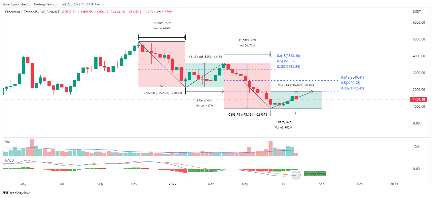 Harga ETH mengalami penurunan selama 77 hari dengan rentan waktu November 2021-Januari 2022 sebesar 55,65%, dari harga $4.868 ke $2.159 dan membentuk sebuah fase impulsif wave pertama pada bearish season.