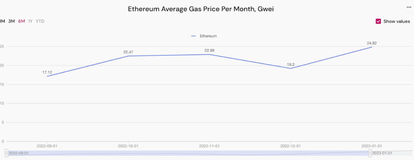Gas fee Ethereum naik dari 19,2 gwei pada Desember 2022 menjadi 24,82 gwei pada Januari 2023. Salah satu indikator utama kenaikan gas fee adalah tingginya aktivitas pengguna dalam jaringan.