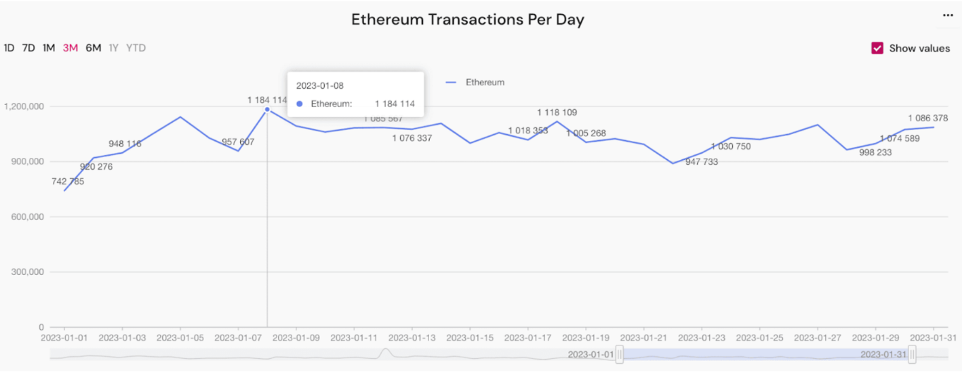 Jumlah transaksi di Ethereum meningkat mencapai titik tertingginya di tahun ini pada 8 Januari dengan 1.184.114 transaksi per hari. Sejak itu, jumlahnya terus berada di kisaran 1 juta transaksi.
