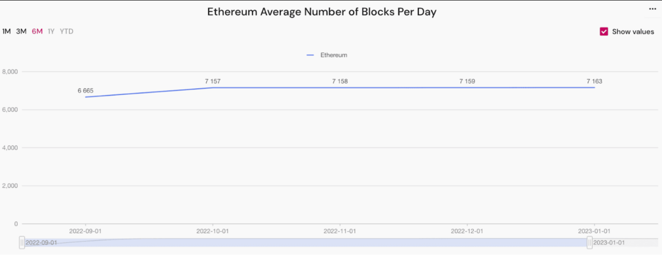 Setelah The Merge, data di dalam blok rata-rata stabil di sekitar 0,01% setiap bulan. Total ukuran blok Ethereum per bulan untuk Januari ini mencapai 17,24 GB, naik 7,08% dari total Desember 2022 sebesar 16,1 GB.
