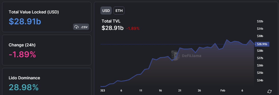 Protokol decentralized finance (DeFi) di jaringan Ethereum juga terus menunjukkan kenaikan total value locked (TVL) atau aset yang disimpan dalam protokol. Total TVL Ethereum saat ini mencapai $28,9 miliar.