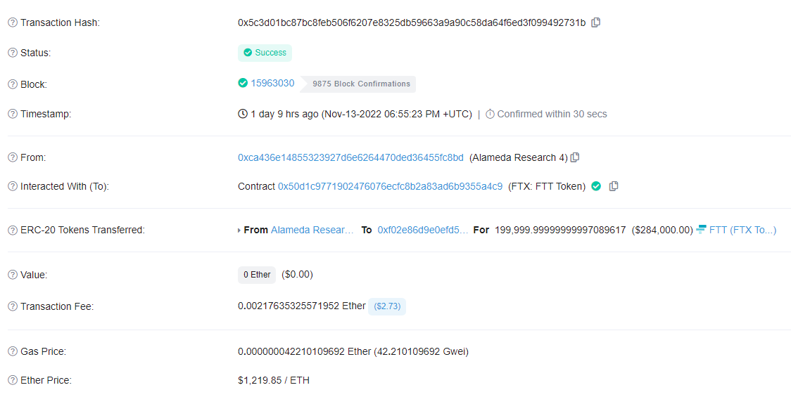 Transfer token FTX oleh Alameda Research. (sumber: Etherscan)