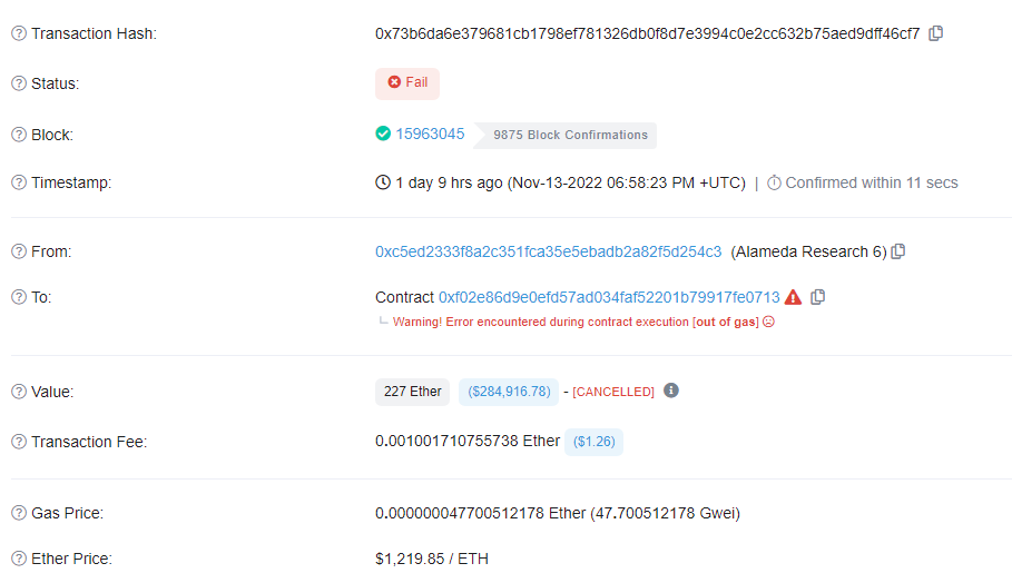 Alameda gagal mentransfer ETH. (sumber: Etherscan)