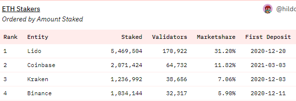Menurut data Dune, empat staker ETH terbesar adalah platform-platform yang menyediakan layanan staking, yakni Lido Finance, Coinbase, Kraken, dan Binance. Keempatnya menyumbang 56% dari semua ETH yang di-staking di jaringan.