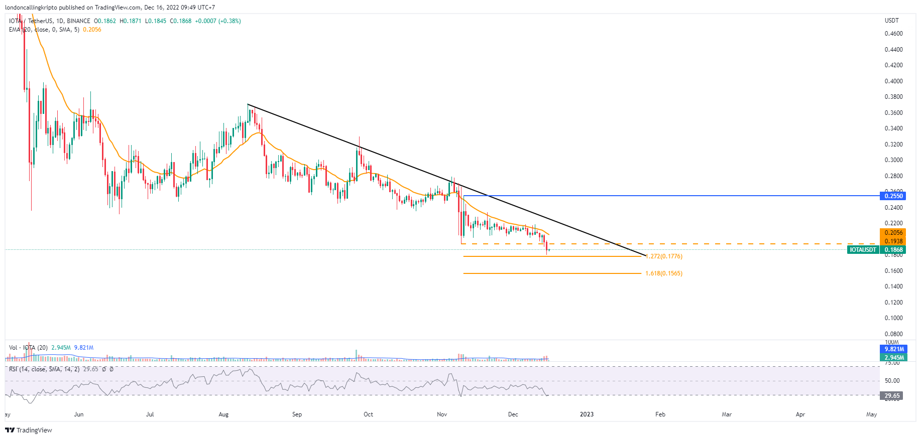 Penutupan kandil harian IOTA pagi ini berhasil breakdown major support yang terbentuk pada penutupan kandil harian 9 November di level $0,1938.
