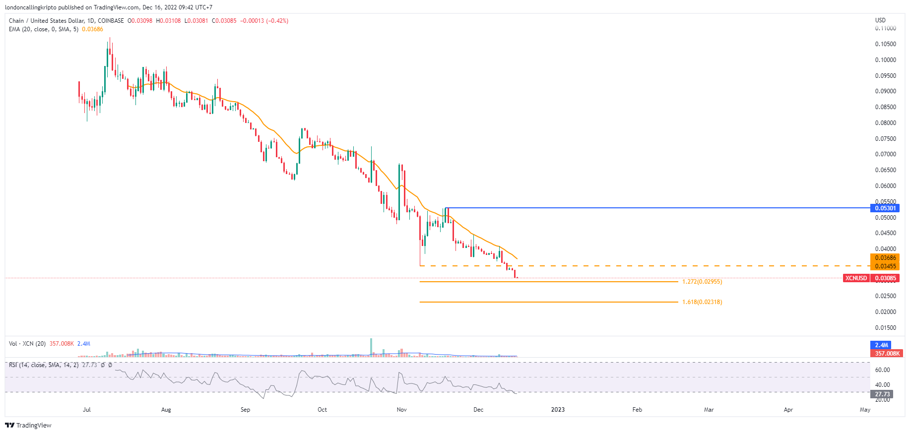 XCN kembali melanjutkan tren negatifnya setelah penutupan kandil harian 12 Desember berhasil breakdown major support yang terbentuk pada 8 November di level $0,03455.