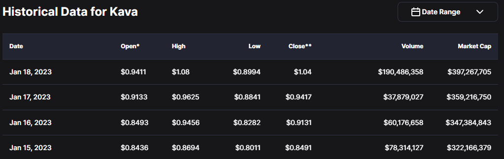 Historical Data KAVA by: Coinmarketcap