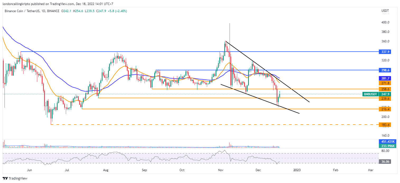 Pergerakan harga BNB berhasil bounce setelah membentuk lower low tersebut. Hal tersebut terkonfirmasi pada penutupan kandil harian 17 Desember yang berhasil ditutup hijau dengan kenaikan sebesar 4,71%.