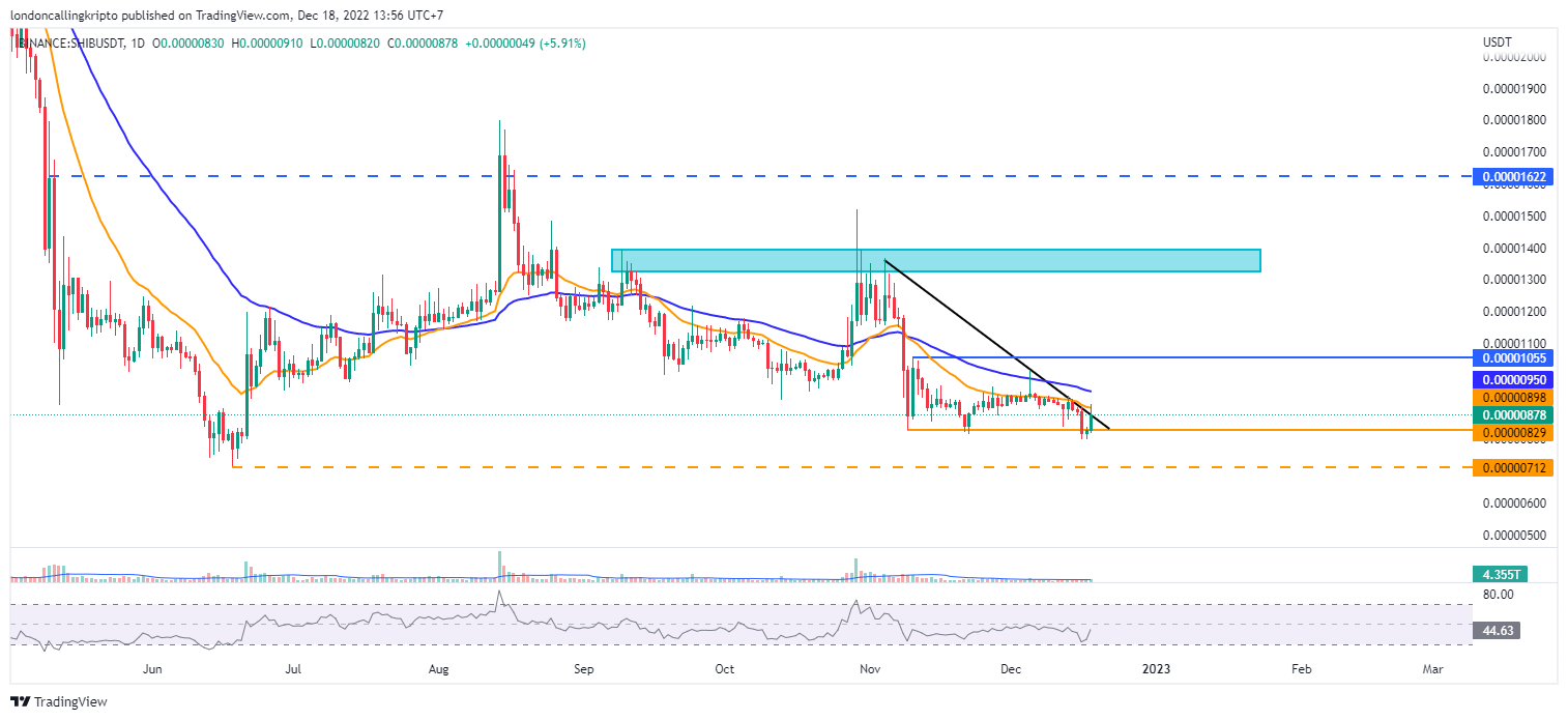 Penurunan harga pada penutupan kandil harian 16 Desember berhasil ditahan support yang terbentuk pada 9 November di level $0,00000829.