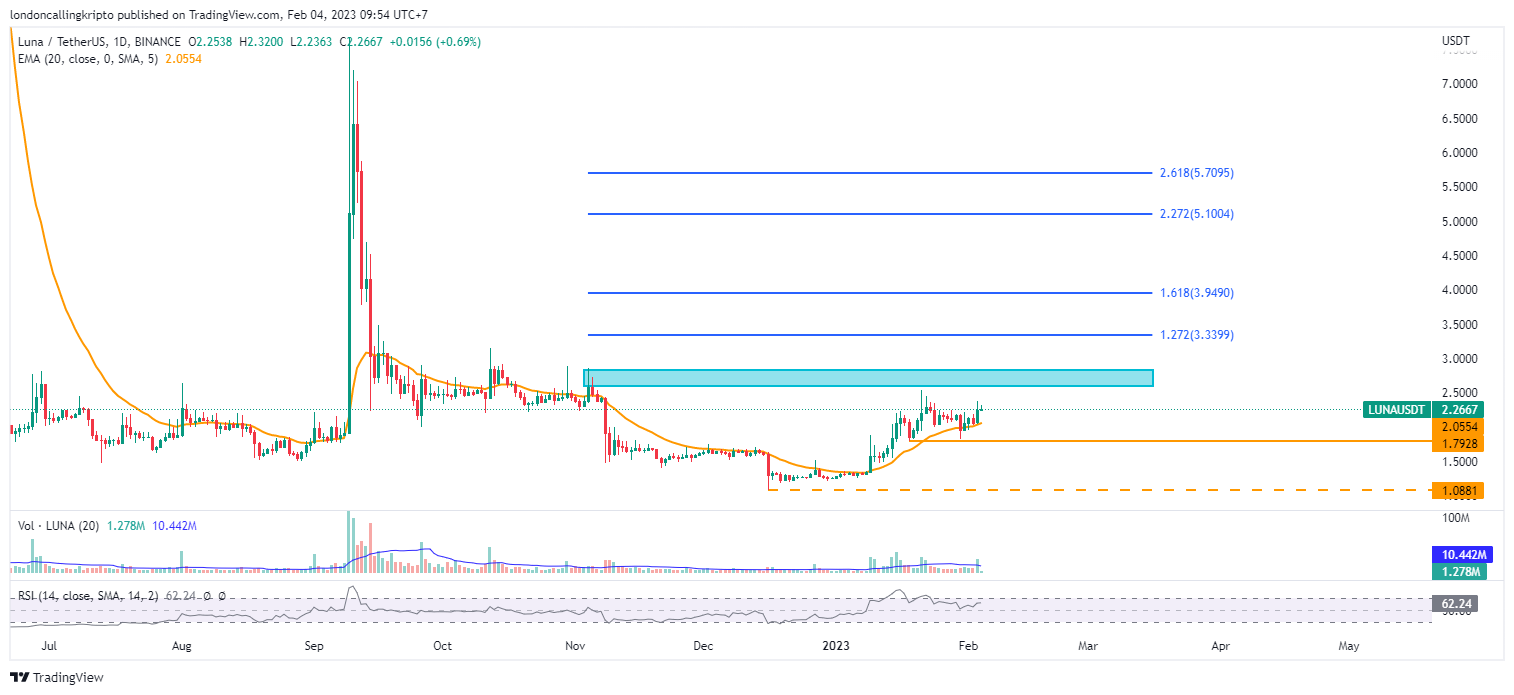Kenaikan harga LUNA terlihat mendekat harga tertinggi pada penutupan kandil harian 22 Januari di level $2,4530.