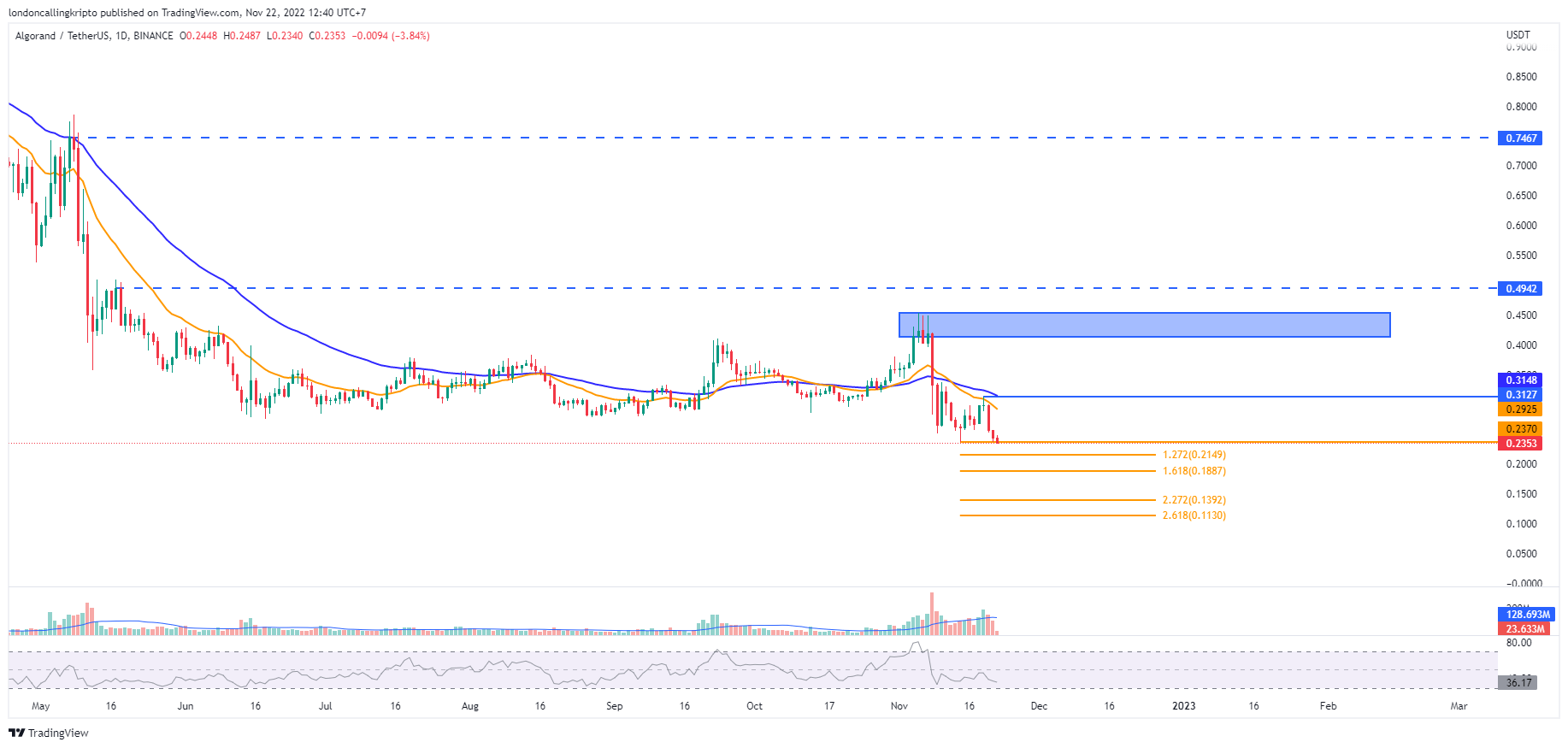 Usaha pullback ALGO terlihat melemah, setelah penutupan kandil harian 19 November membentuk doji candlestick. Benar saja, penutupan kandil harian 20 dan 21 November ditutup merah dengan penurunan sebesar 20,64%.