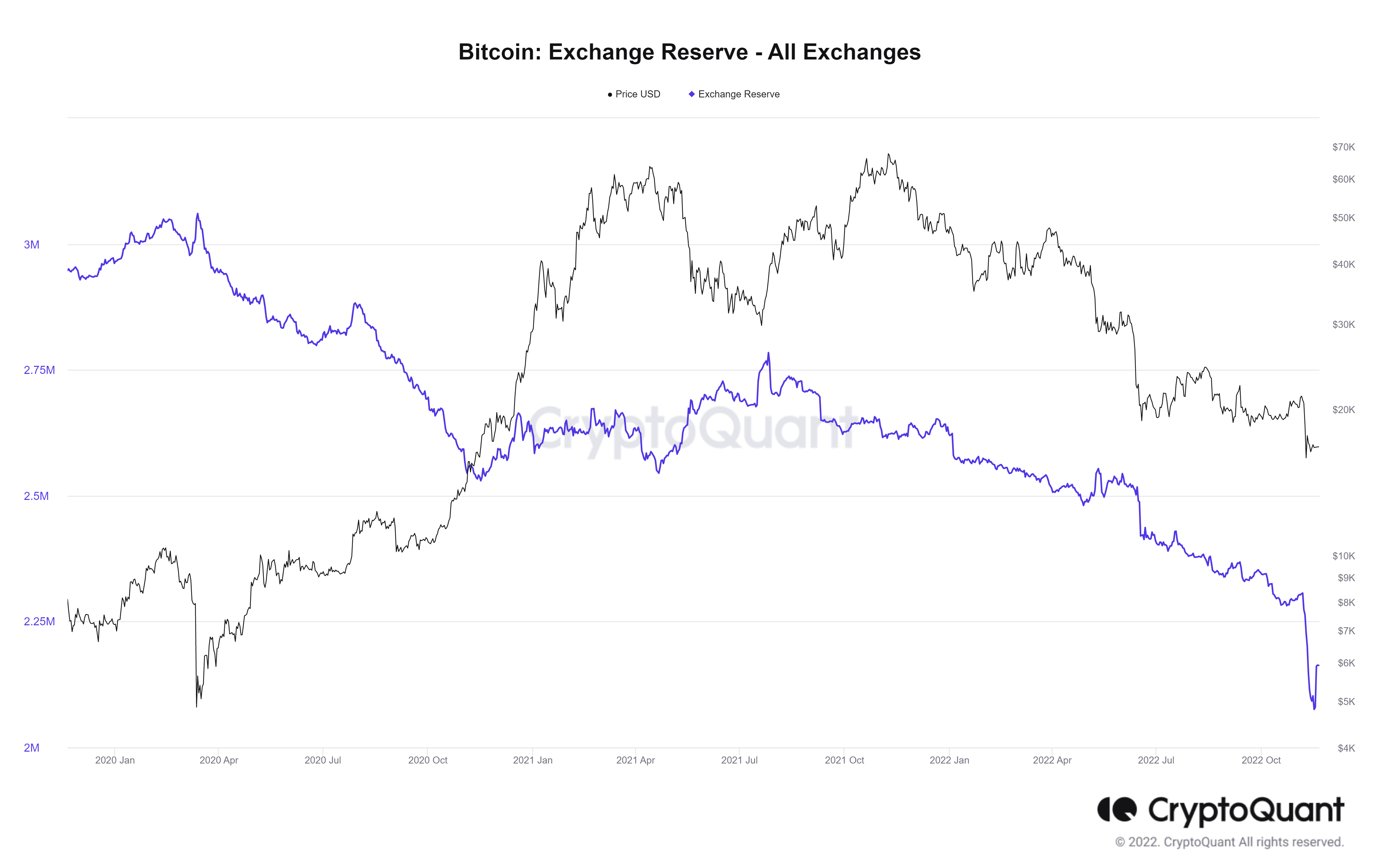 Ketersediaan Bitcoin di bursa sentral (exchange reserve) mengalami penurunan yang signifikan, terutama setelah bangkrutnya FTX. Tidak sedikit pemegang aset Bitcoin melakukan penarikan dari bursa sentral menuju dompet eskternal. Hal tersebut sebagai bentuk trust issue investor terhadap bursa sentral.