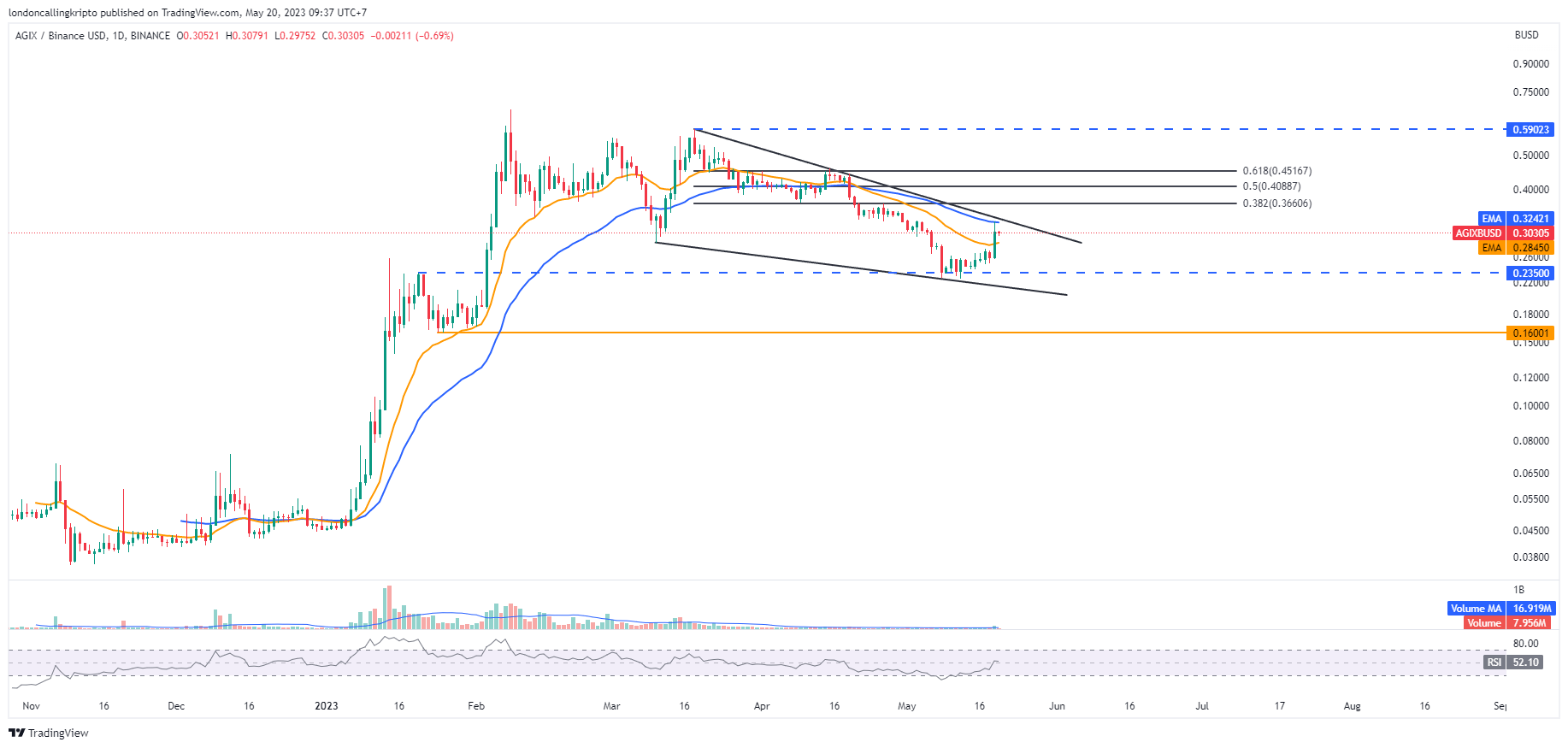 20-Day EMA di level $0,28445 beralih fungsi menjadi support terdekat apabila pergerakan harga AGIX kembali koreksi.