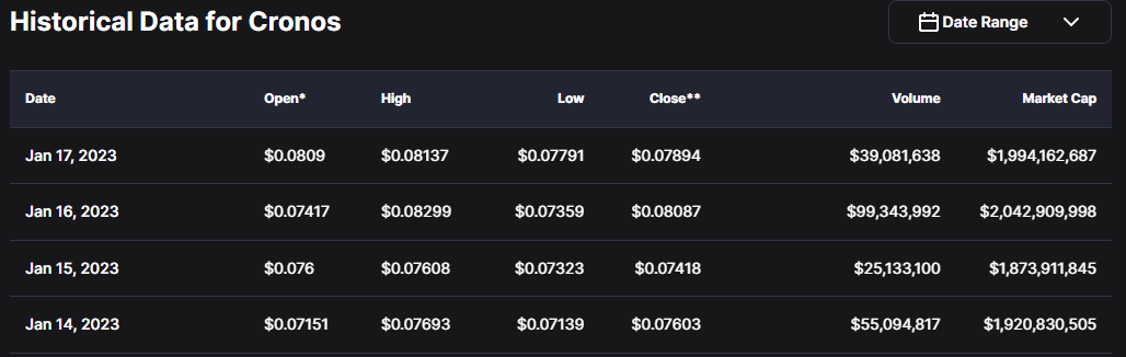 Naiknya harga CRO tersebut dibarengi dengan volume perdagangan mumpuni. Terjadi lonjakan tinggi pada volume perdagangan 16 Januari, yang tercatat sebesar $99.343.992, naik hampir empat kali lipat dari penutupan volume perdagangan 15 Januari, yang hanya sebesar $25.133.100.