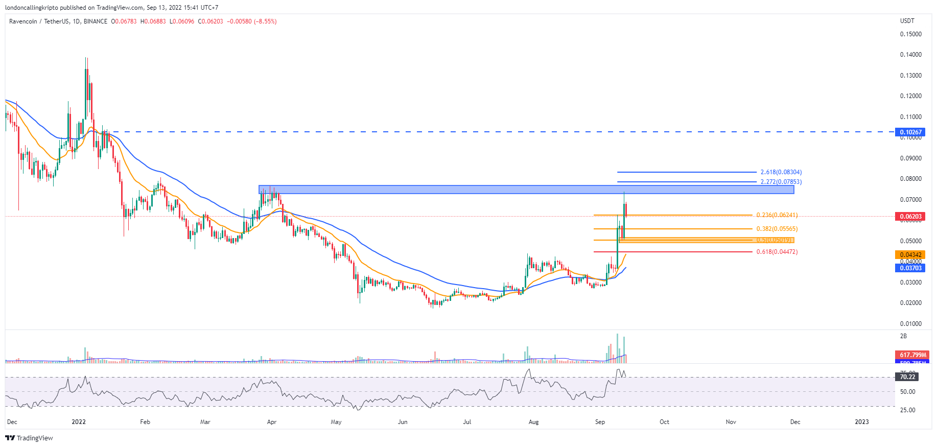 Laju bullish RVN tertahan saat menyentuh area resistance pada level $0,07285-$0,07664. Pergerakan harga RVN mengalami penolakan setelah pumping menyentuh area tersebut dan mengubah arah harga menjadi turun.