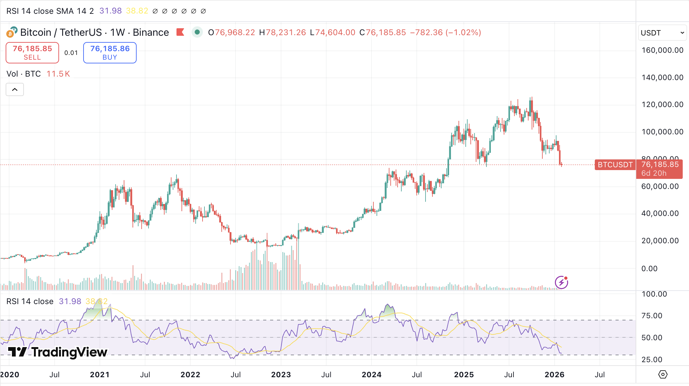 Data TradingView menunjukkan BTC/USD turun lebih dari 11% dalam sepakan terakhir. Aset kripto terbesar berdasarkan kapitalisasi pasar ini kehilangan sejumlah level support penting—termasuk true market mean di US$80.700—membuat banyak trader bersikap pesimistis terhadap pergerakan harga ke depan.