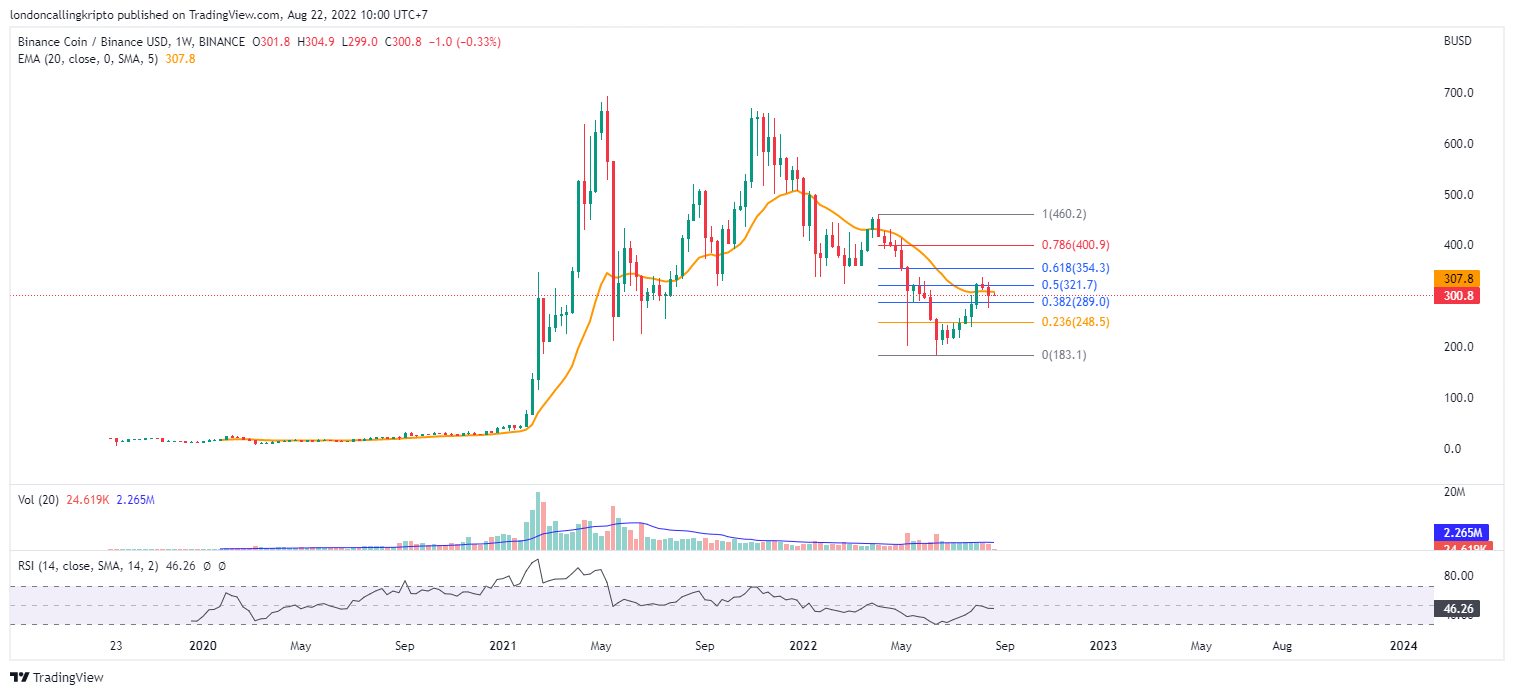 Kandil mingguan BNB kembali ditutup merah, turun sebesar 5%. Penurunan tersebut masih terbilang kecil, apabila jika dibandingkan dengan penurunan yang dirasakan oleh cryptocurrency pada top 20 CMC (Coinmarketcap). Penutupan kandil mingguan 8 Agustus yang berbentuk shooting star candlestick menjadi indikasi terhadap penurunan dipekan kedua bulan Agustus.