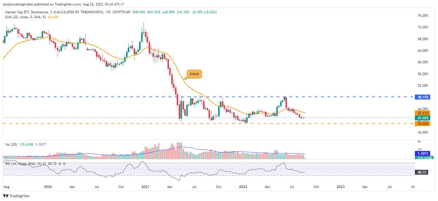 Jika dominasi Bitcoin lanjut bergerak naik, target pertama berada pada day-20 EMA di level 42,64%. Kenaikan dominasi kemungkinan akan memberikan pengaruf positif untuk membantu pergerakan harga Bitcoin agar kembali naik.