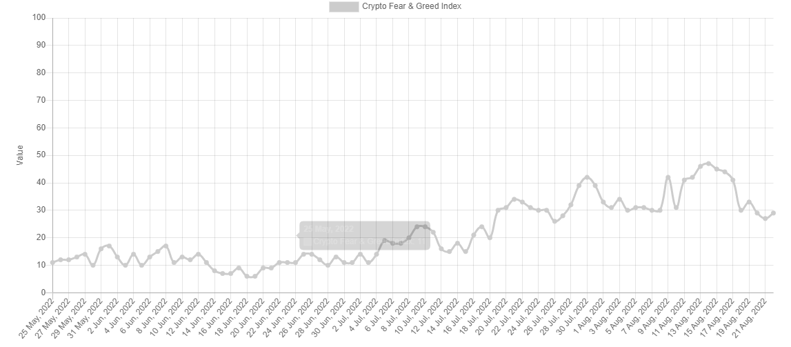 Fear and greed index pada hari Minggu tanggal 21 Agustus menyentuh level terendah di bulan Agustus yaitu ditutup pada level 27. Kondisi tersebut merubah sentimen pasar yang sudah membaik menjadi negatif kembali.