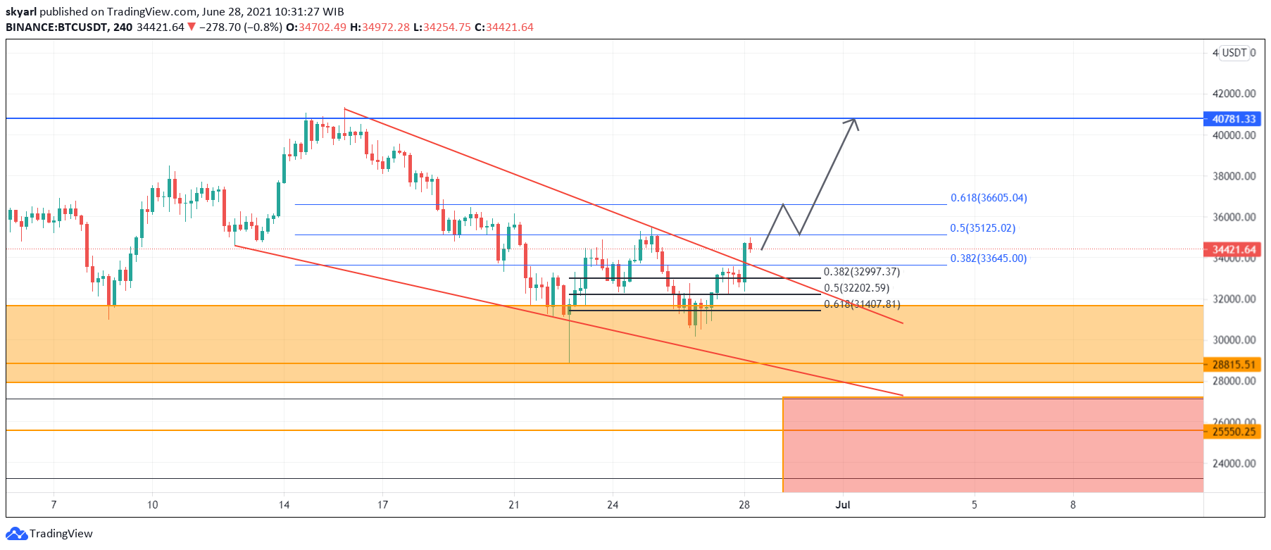 Kini pergerakan Bitcoin telah menyentuh harmonic resistance ratio 0.5 fibonacci retracement pada harga US$35,125. Pada titik ini ada kemungkinan harga Bitcoin akan di reject dan mengalami koreksi kembali atau sebaliknya, harga Bitcoin meneruskan laju uptrend nya.