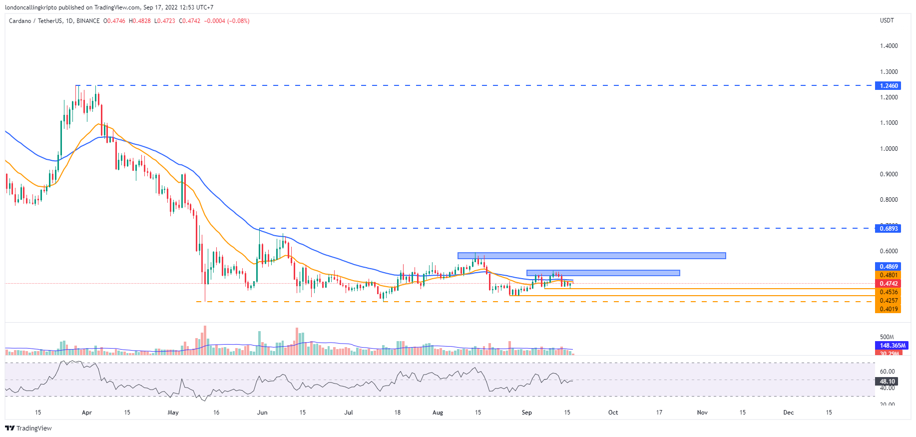 Penurunan harga ADA tertahan pada support di level $0,4536 dan saat ini terlihat kembali bounce bergerak naik menuju day-20 exponential moving average (EMA) pada level $0,4802 sebagai dinamis resistance.