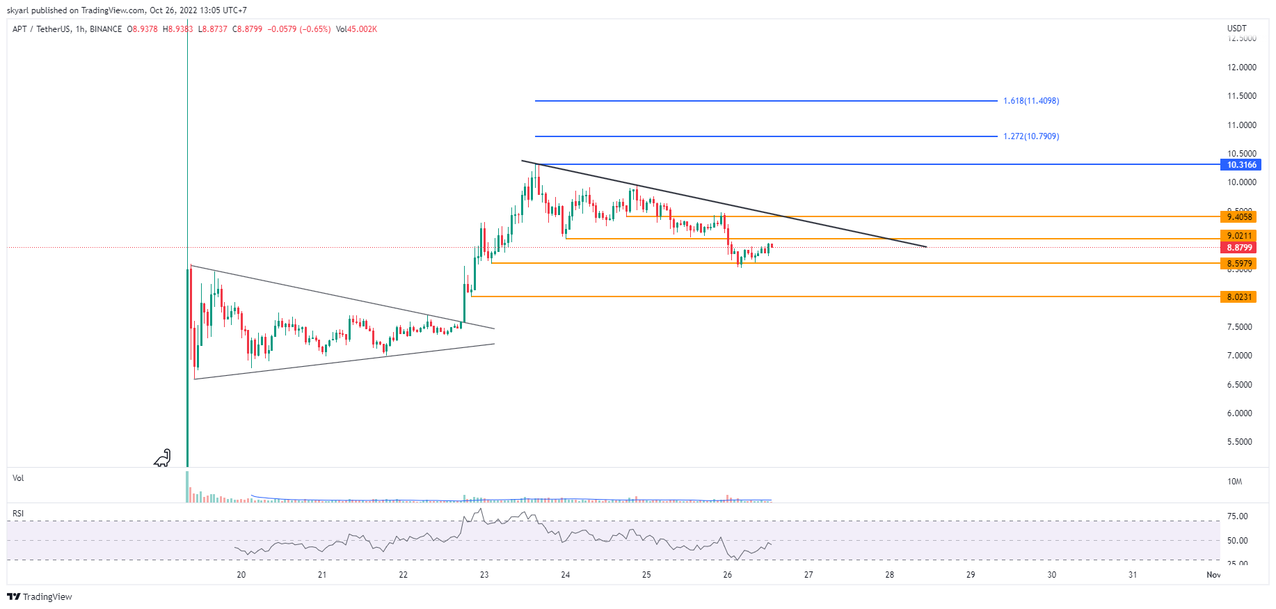 Target naik terdekat APT berada pada level $9,4058 yang merupakan resistance dari descending line.