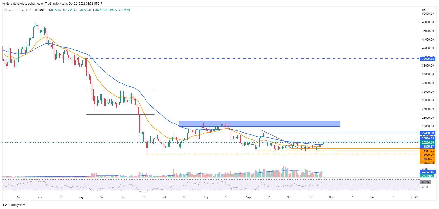 Resistace di level $22.488 menjadi target utama laju bullish Bitcoin saat ini, setelah berhasil breakout descending line pada 4 Oktober dan kembali turun untuk retest area support.