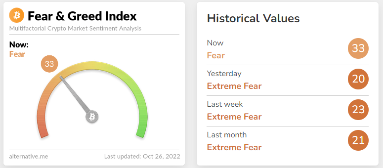 Kondisi ini berhasil merubah sentimen market. Fear and greed index berhasil merangkak naik ke level 33 dengan kategori fear, yang sebelumnya konsisten berada pada kategori extremen fear