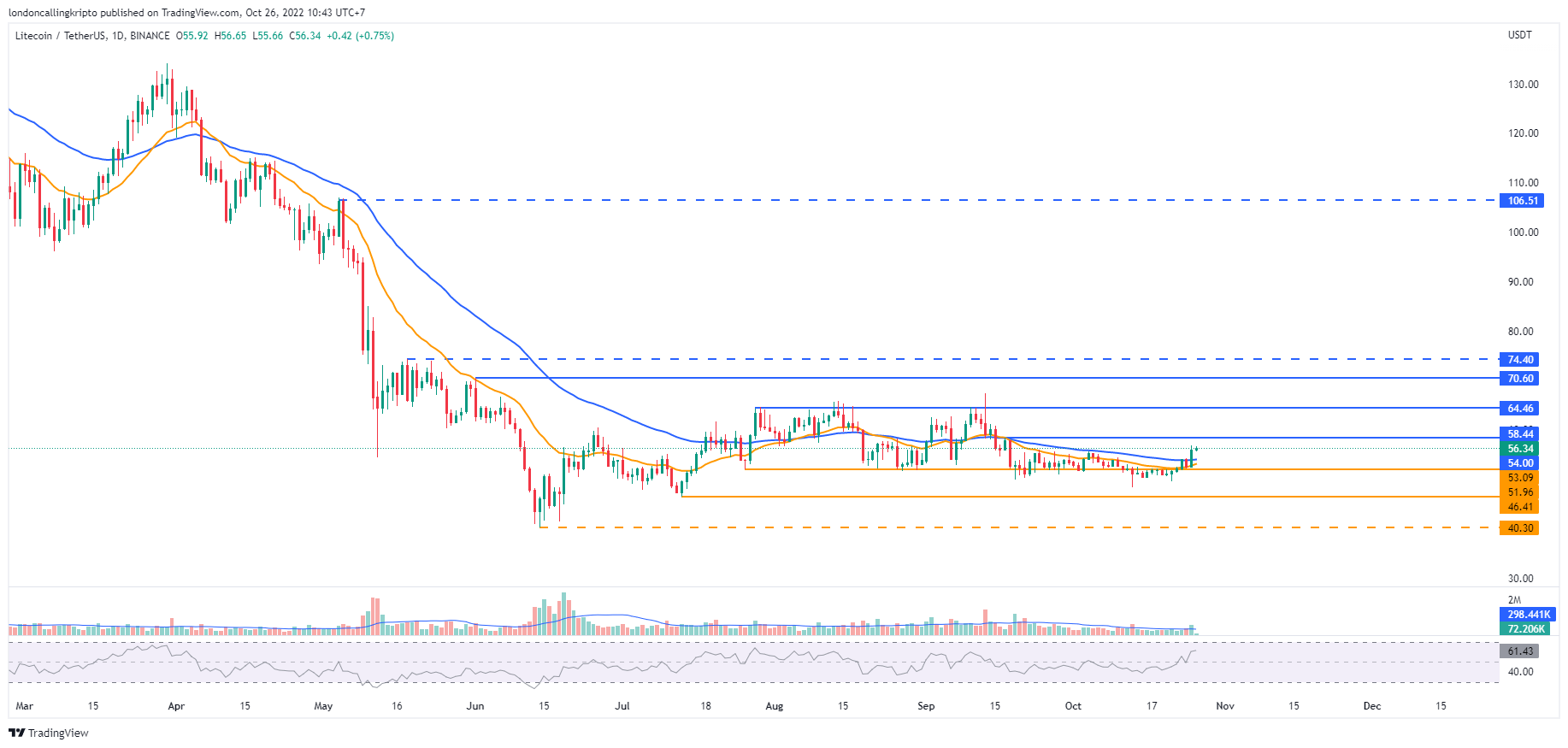 Resistance yang terbentuk pada 17 September di level $58,44 menjadi target naik terdekat LTC saat ini.