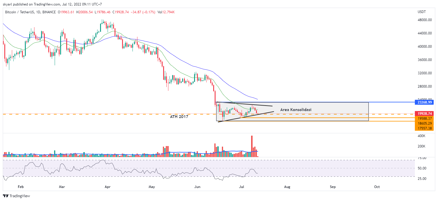 Saat artikel ini dibuat harga Bitcoin terkonfirmasi kembali bergerak dibawah EMA20 yaitu berada pada harga $19,888 dan hampir menyentuh titik support ATH 2017 dan symmetrical triangle pada harga 19,588.
