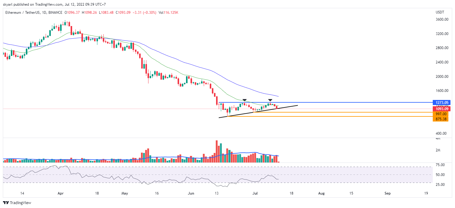 Penurunan harga ETH ditandai dengan adanya rejection di titik resistance pada harga $1,273 sebanyak dua kali yaitu pada tanggal 26 Juni 2022 dan 8 Juli 2022. Pergerakan harga ETH saat artikel ini dibuat berada pada harga $1,093 dan terlihat mencoba untuk breakdown ascending triangle pattern-nya.