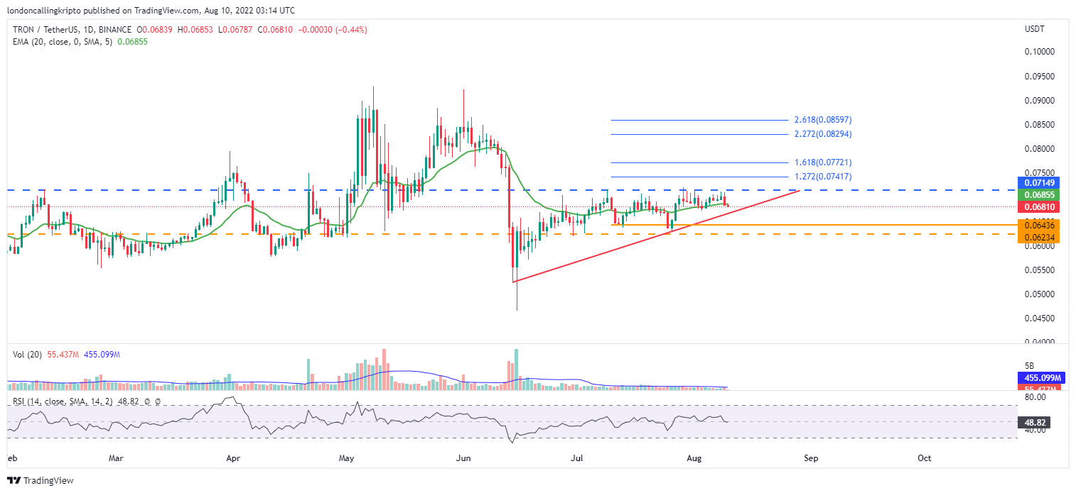TRX yang menempati urutan ke-16 berdasarkan kapitalasi pasar kembali mengalami penolakan di titik resistence pada 29 Juli dan kandil harian ditutup merah.