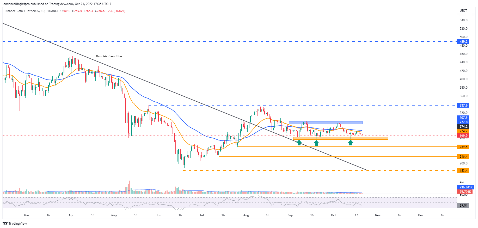 Daily candle BNB pagi ini ditutup pada harga $269, level tertinggi berada pada harga $273,4 dan level terendah berada pada harga $267,3.