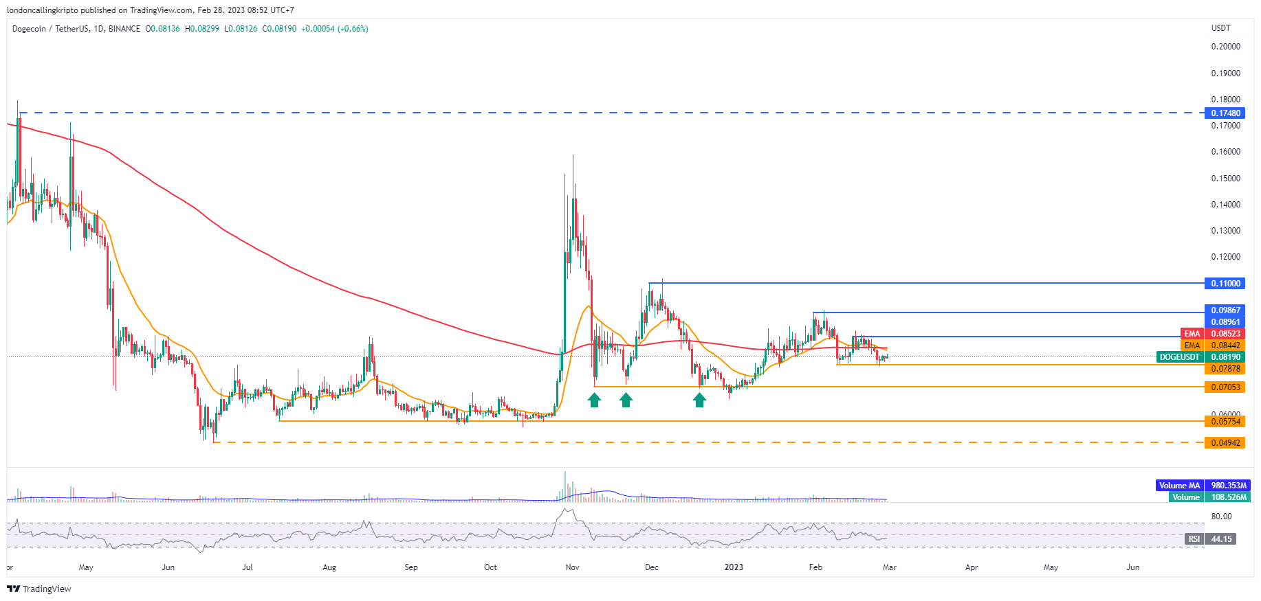 Pergerakan harga DOGE masih tertahan dibawah 20-day EMA sebagai resistance terdekat di level $0,08442.