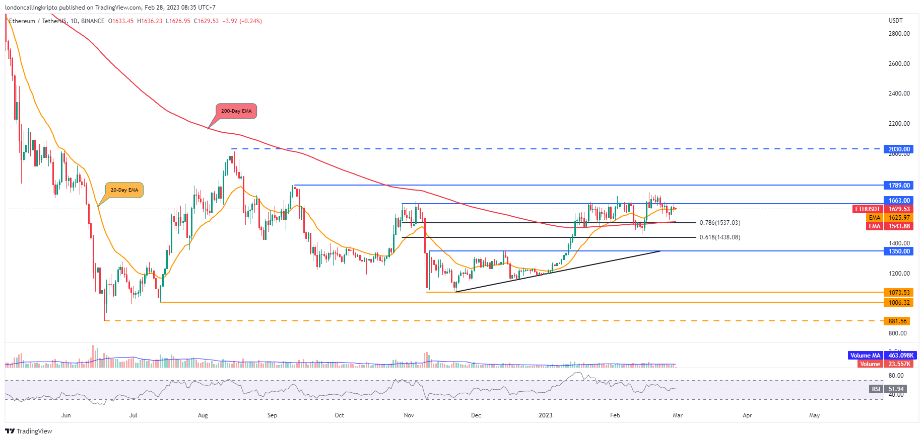Harga tertinggi pada penutupan kandil harian 29 Oktober di level $1.663 masih menjadi penghalang solid untuk laju bullish ETH. Harga ETH kembali turun setelah menyentuh titik tersebut.
