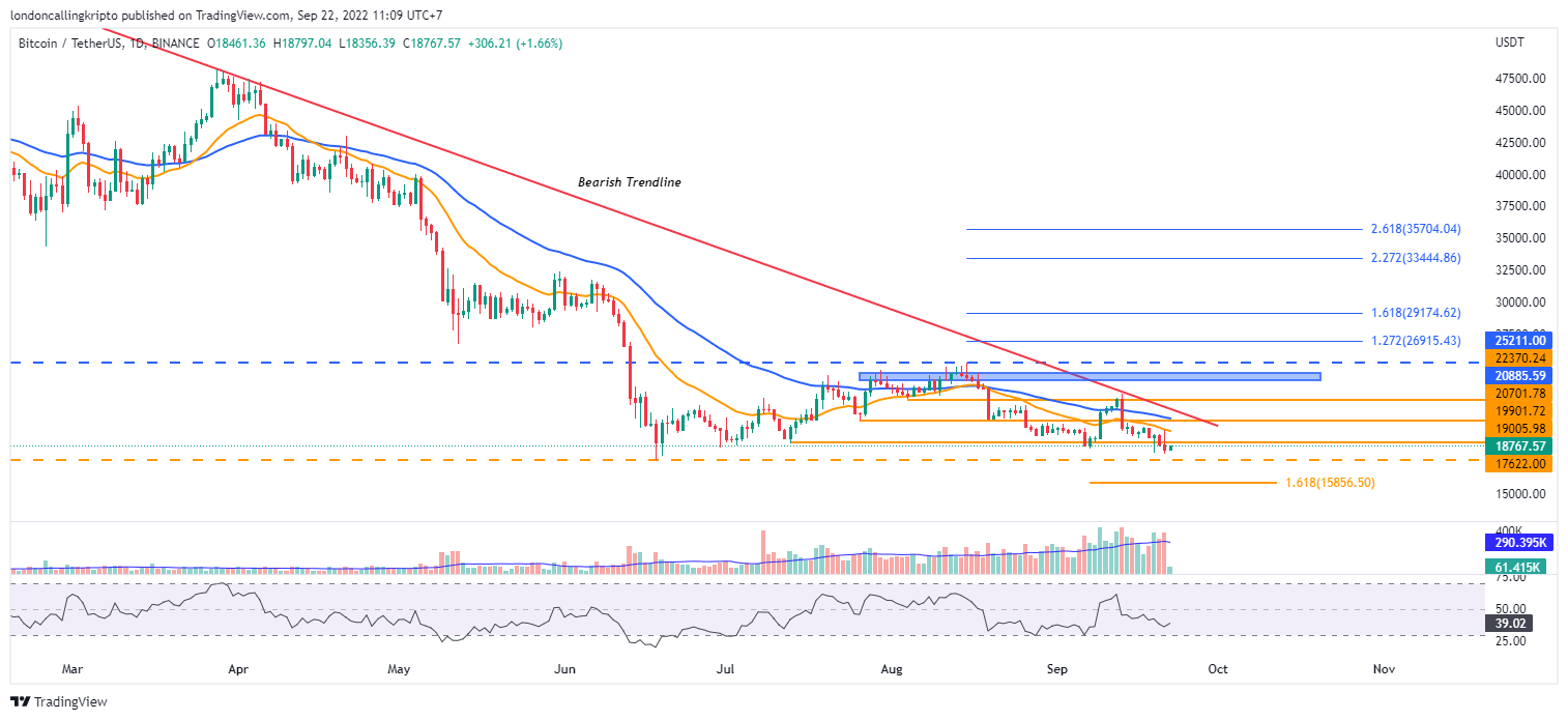 Kandil harian Bitcoin ditutup merah dengan penurunan sebesar 2,19%, ditutup pada harga $18.461, dengan level tertinggi berada pada harga $19.956 dan level terendah berada pada harga $18.125.