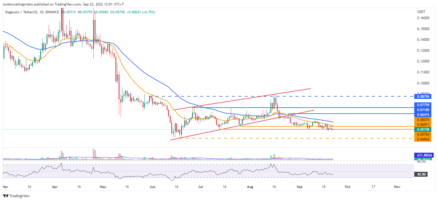 Penurunan harga DOGE saat ini masih tertahan support pada level $0,05754 dan membentuk lower low (LL) baru pada fase penurunan yang dimulai pada 17 Agustus lalu.
