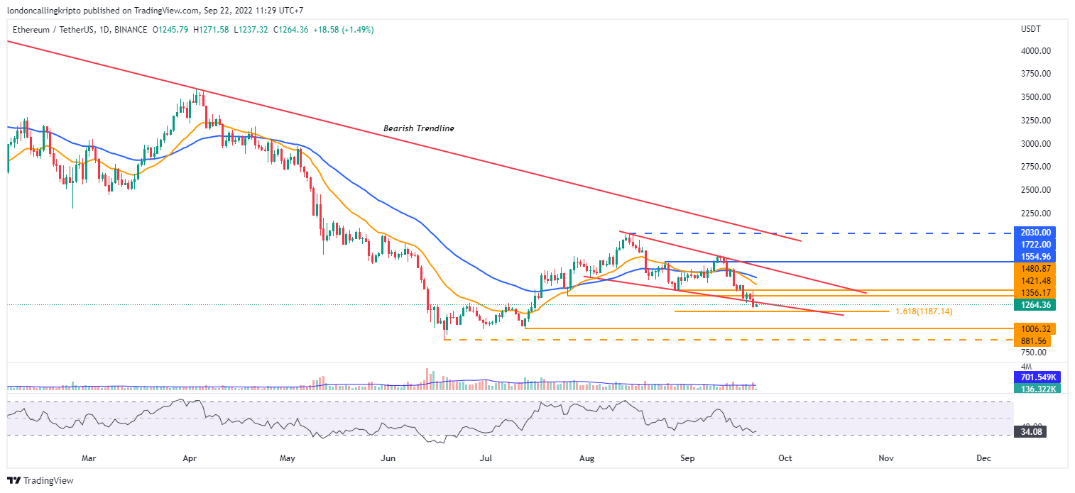 Jika harga ETH valid breakdown, kemungkinan pergerakan harga ETH akan melanjutkan penurunannya hingga mencapai level $1.187 sebagai support terdekat.