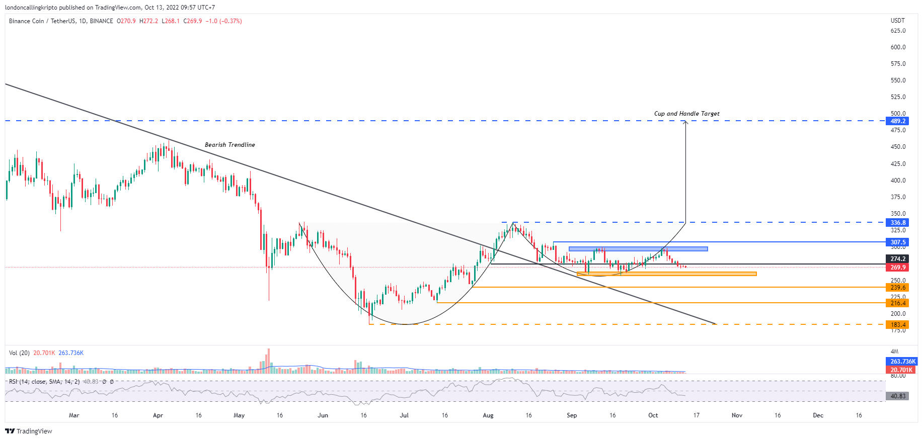 BNB masih bergerak sideways setelah penutupan kandil harian 10 Oktober berada dibawah support penting yang sekarang menjadi resistance terdekat di level $274,2.